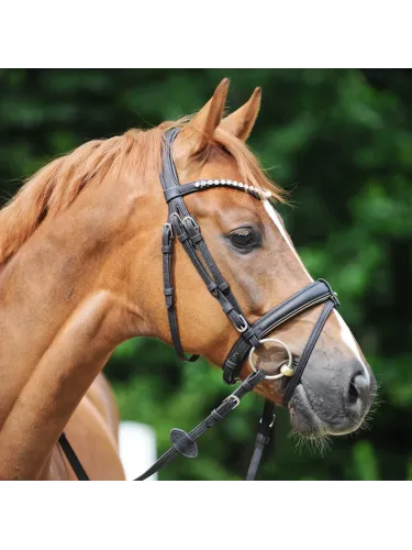 Premium quality padded leather bridle with anatomical noseband and headpiece. Includes reins and a removable browband with large stones for a stylish and practical look.