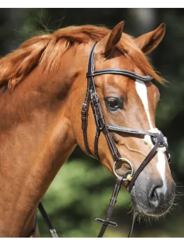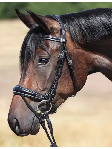 Anatomical bridle, ensures a quiet positioning of the bit with direct effect on lips and tongue, for clear giving of aids.