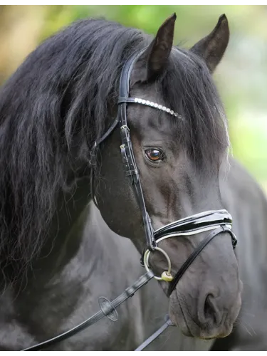 High quality and elegant noseband with wide, anatomically shaped headpiece and additional ear clearance. Softly padded for comfort and decorated with a curved headband featuring dark crystals.
