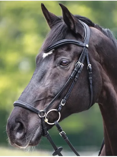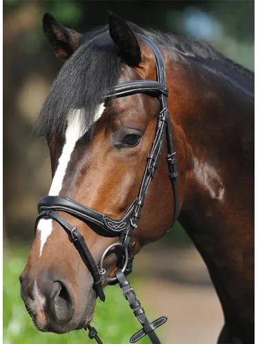 The crossed noseband bridle features an anatomically shaped headpiece and a curved browband for a comfortable fit. Soft lining on the noseband, browband, headpiece, and nose stud ensures gentle contact.