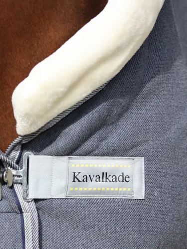 The Kavalkade "Elegance" transport and cooler rug is stylish and features a fashionable fur collar. Suitable for transport and cooling, it is made from heavy fleece with a brushed inner lining that effectively wicks away moisture. The internal cross surcingles are detachable. The rug also features a deep tail strap, double swivel chest closure, and blue decorative piping.