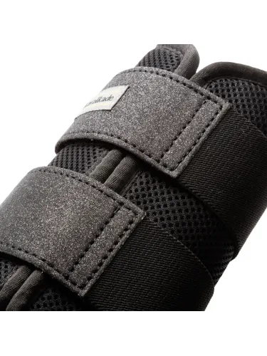 Kavalkade’s robust "Star" overreach boots feature a soft, shock-absorbing neoprene lining and an easy-care synthetic leather exterior. The pastern and heel areas are softly padded with neoprene trim. The patent leather finish and subtle glitter piping give the boots an elegant look. They have a sturdy double Velcro closure.
