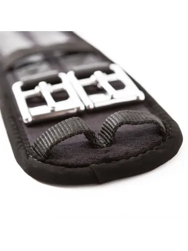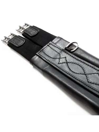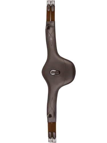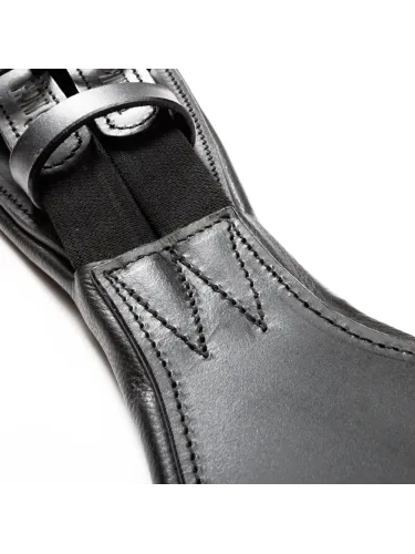 Anatomically shaped leather saddle girth with belly flap for effective protection against horseshoes and studs. Elasticated strap ends and high-quality fittings ensure secure fastening and comfort.