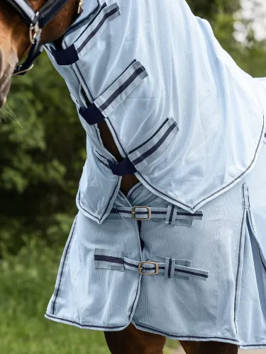 Lightweight and breathable fly rug with neck part that provides optimal protection against insects and sunlight. The shiny fabric reflects sunlight to help prevent overheating while ensuring comfortable wear in the pasture and paddock.