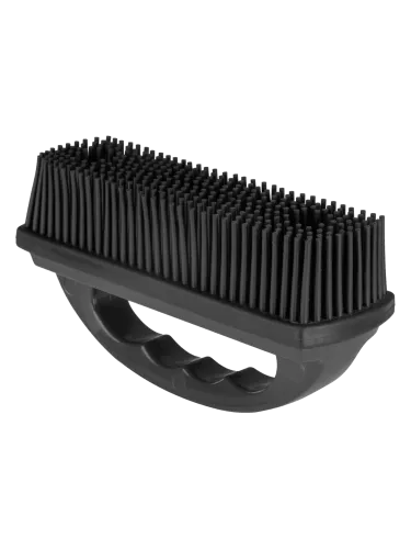 A cleaning and massage brush for horses with a flexible back and rubber knobs.
