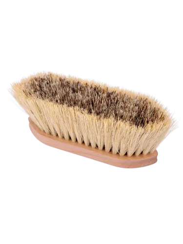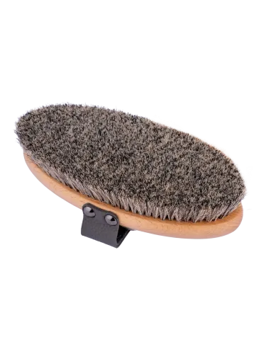 A cleaning brush with horsehair bristles and a flexible back.
