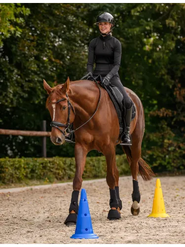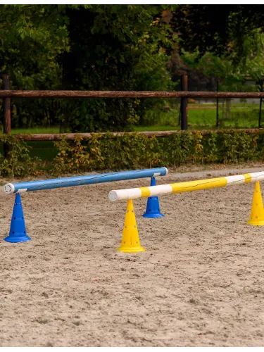 Durable and versatile set for horse training – 8 sturdy XL pylons with 50 cm height. Upper opening for pole supports (product no. 1505202) to create small jumps or cavaletti. Includes practical bag for space-saving storage and transport. Ideal for groundwork, trail, slalom, demarcation or small jumps.